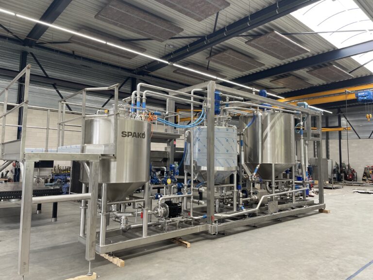 Eine Kreiselpumpe auf dem Skid sorgt für ausreichend Flüssigkeitsdruck für die Sprühköpfe und reinigt die Leitungen mit hoher Geschwindigkeit. Dies gewährleistet eine effektive Reinigung und optimale Hygiene. Dank dieser Kombination aus Funktionen bietet die Saucenanlage eine komplette und zuverlässige Lösung für moderne Produktionsprozesse.